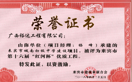 近期,从来宾市建筑业联合会传来喜讯,九游·体育(jiuyou.com)官方网站承建的“来宾城南幼儿园建设项目”“来宾市城南初级中学建设项目”“来宾飞龙小学建设项目工程总承包”“裕达·金碧天誉B区17#楼”和“裕达·金碧天誉B区18#楼”共5项工程项目被评为来宾市第十六届“红河杯”优质工程,这是继2011年至2017年荣获的25项“红河杯”优质工程之后,再获此荣誉。
