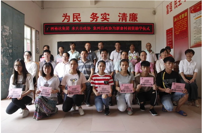 8月22日上午,象州新寨村16名贫困大学生每人都收到了来自裕达慈善基金会、来宾政协捐助的4000元助学资金。来宾市政协主席韦善国、象州县委书记邓应文、象州县政协主席翁秋德、我集团副总裁梁锋等领导出席了助学仪式。