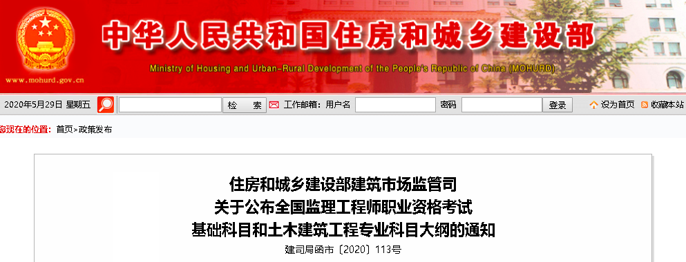 根据《住房和城乡建设部 交通运输部 水利部 人力资源社会保障部关于印发<监理工程师职业资格制度规定><监理工程师职业资格考试实施办法>的通知》(建人规〔2020〕3号),我们会同有关部门编制了《全国监理工程师职业资格考试大纲》,经人力资源社会保障部审定,现向社会公布,并于2020年启用。考试大纲可从住房和城乡建设部官网“政策发布”栏目下载。