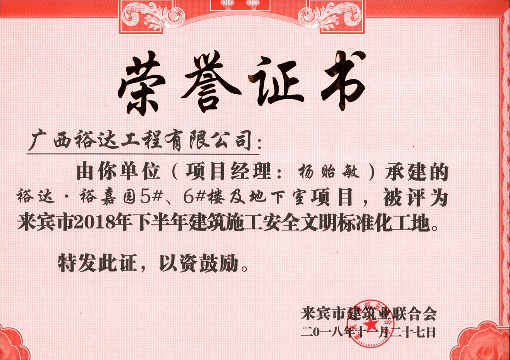 来宾市2018年下半年安全文明标准化工地(裕达。裕嘉园5#、6#楼及地下室)